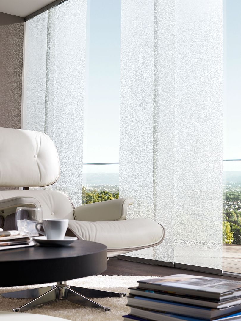 Die Paneele sind in individuellen Größen und praktisch unendlich vielen verschiedenen Stoffdesigns erhältlich. Die Paneele lassen sich einfach abnehmen und austauschen (Befestigung mittels Klettband). Die Montage der Schiebevorhänge erfolgt wahlweise an Wand oder Decke. Besonders für große Fenster, Glasfronten oder als Raumteiler bestechen Flächenvorhänge mit ihrer modernen, reduzierten Formensprache.